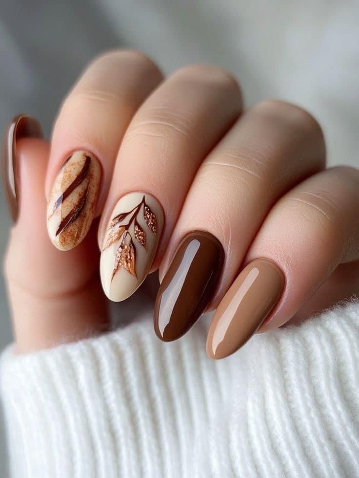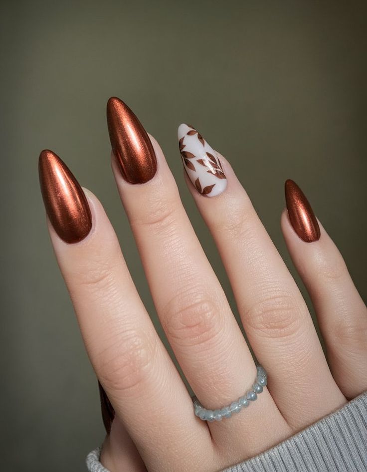 This manicure is pure molten elegance. Four of the nails gleam with a rich bronze chrome that plays beautifully under fall light—like leaves just before they curl at the edges. But the spotlight goes to the accent nail: a soft ivory base with dainty brown autumn leaves, creating a balanced contrast between shimmer and serenity. It’s the kind of art that turns a basic outfit into a full seasonal look. Perfect for date nights, art galleries, or even a Thanksgiving dinner where you need to look casually put together.