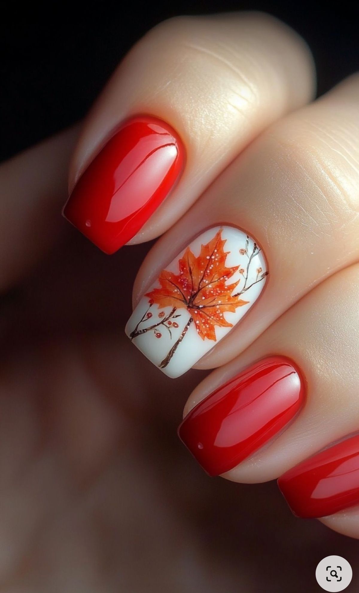 Bold, blocky, and completely impossible to ignore. This red set leans modern classic with a single accent nail that bursts with autumn leaves detail. It’s the kind of manicure that says, “Yes, I have a PSL in one hand and style in the other.”