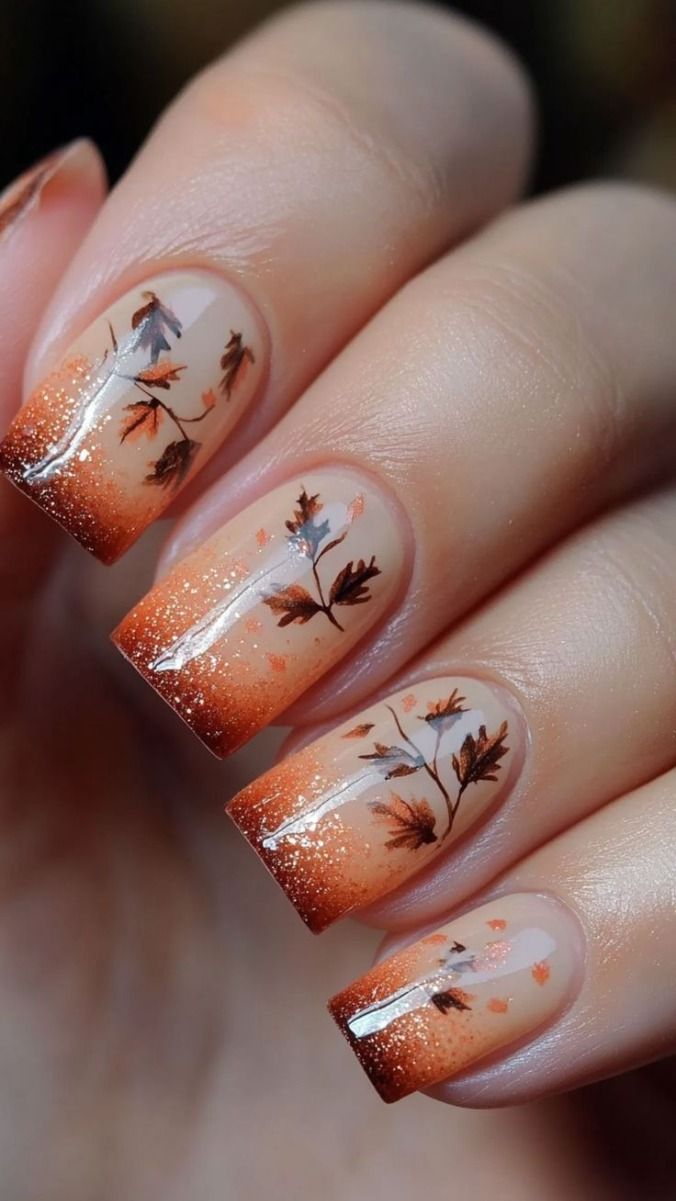 This design is giving editorial fairy tale. The smooth ombre transition from nude to glowing copper tips makes the perfect backdrop for tiny floating autumn leaves. There’s a delicate magic in the air with these — like leaves caught mid-air during golden hour.