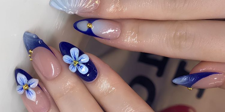 The harmony of vibrant blue tips and delicate floral appliqués creates a captivating yet elegant vibe. These nails exude a bold statement, perfect for evening events where you want to stand out. The addition of gold accents elevates the design, making it both luxurious and playful.