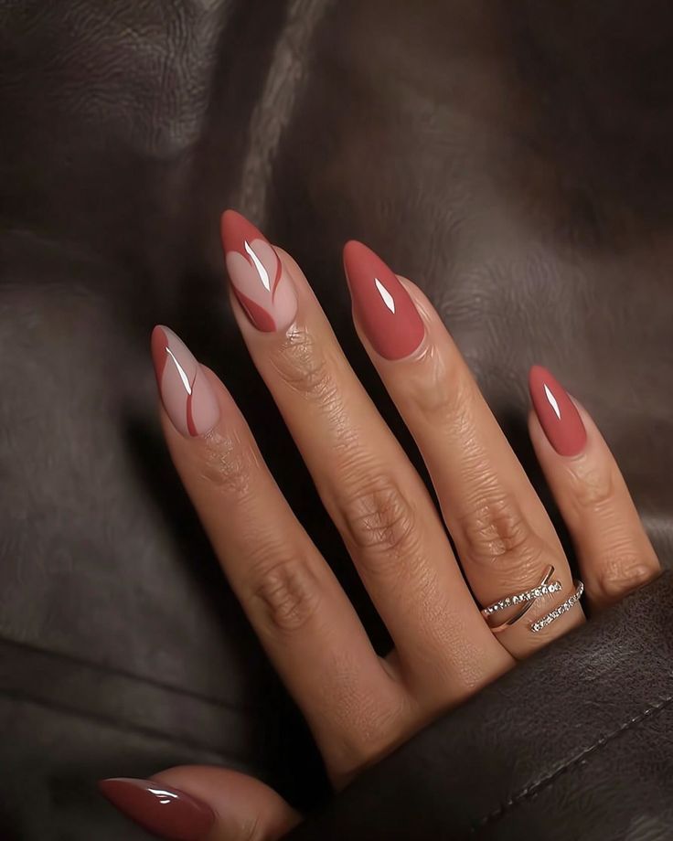 When red meets abstract, autumn magic happens. This look mixes muted brick red with sheer nude bases in almond form. It’s playful yet refined, striking that perfect ideas autumn note. This manicure shines at fall parties, cozy café catch-ups, or even Thanksgiving dinner. Less ideal? Corporate boardrooms where neutrals rule — but then again, sometimes rules are made to be broken.