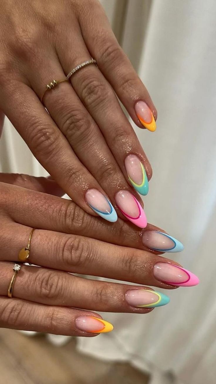 Here’s a cute design 2025 inspo that screams playful. Bright French lines in neon shades across almond tips? A bold choice, but one that instantly livens up autumn neutrals. This one works best for parties, weekends, or creative fields where personality is celebrated. Less suitable for formal environments, but fashion is about balance, isn’t it?