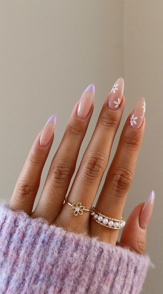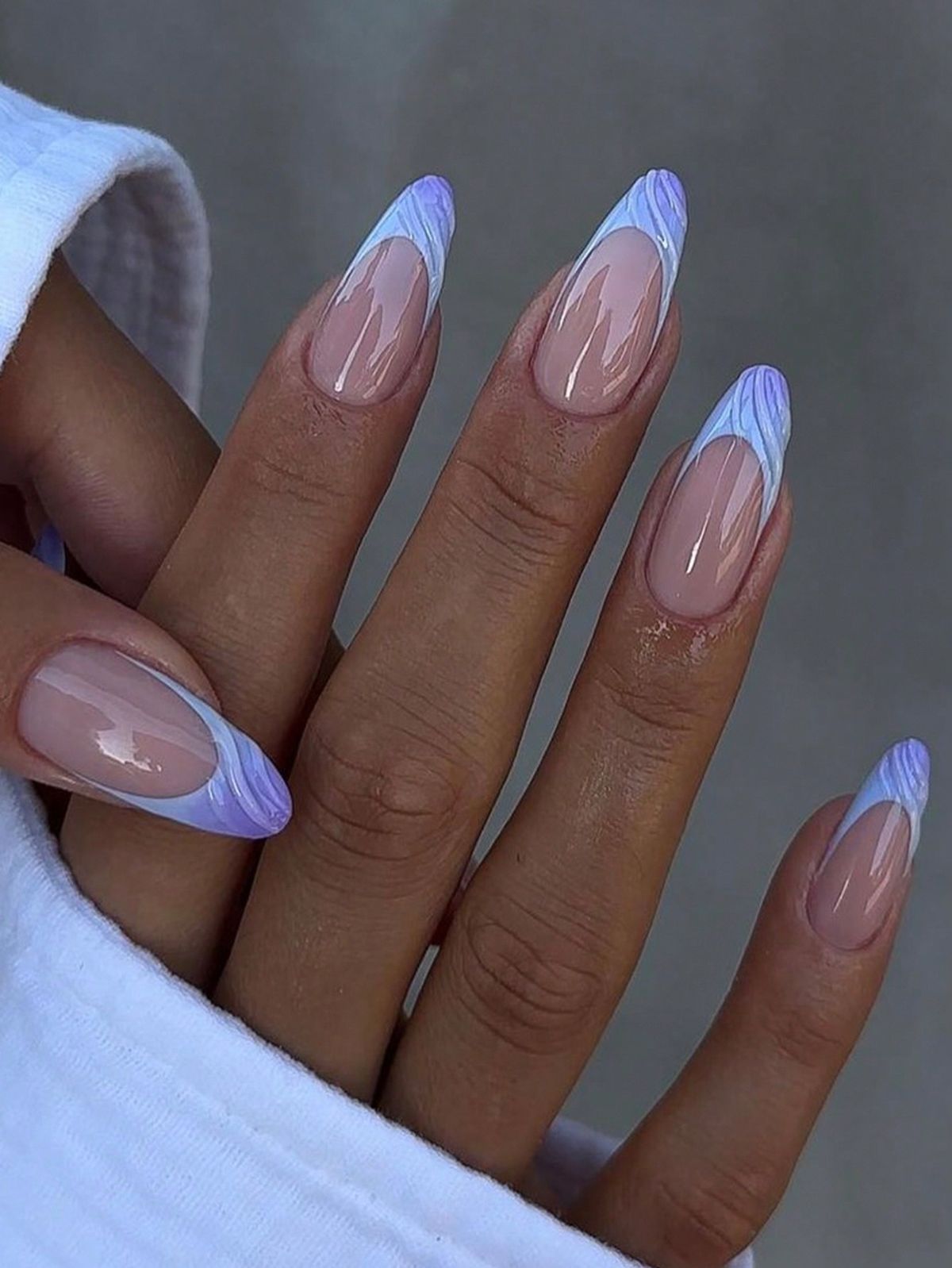 This final look combines French tip tradition with a lilac twist. Soft marbled purple strokes elevate the nude base, making it perfect for transitional fall days when you’re not ready to leave behind spring’s playfulness. It works particularly well for medium to long nails, elongating fingers. Less fitting? Extremely short nails — the effect gets lost.