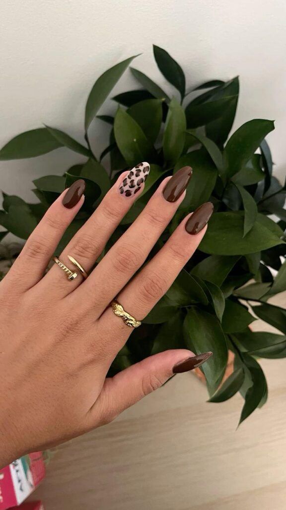 For ideas autumn 2025, nothing feels warmer than brown nails. Here, the almond shape gets a playful update with one leopard accent nail. It’s cute yet still polished, ideal for casual days or coffee dates. The rich chocolate shade pairs beautifully with neutral knits and gold jewelry, though it might not suit those who avoid warmer undertones.