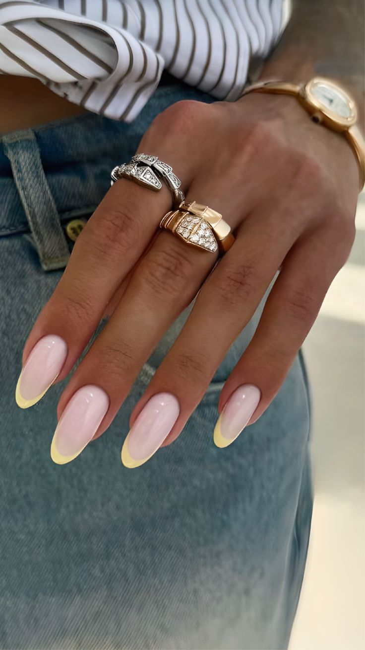 French tips in 2025 are about experimenting with colors, and this almond design nails it with soft yellow tips. The subtle pastel shade makes the look playful yet polished, bridging the gap between cute and classy. It’s practical for daily wear while still being stylish enough for seasonal events.