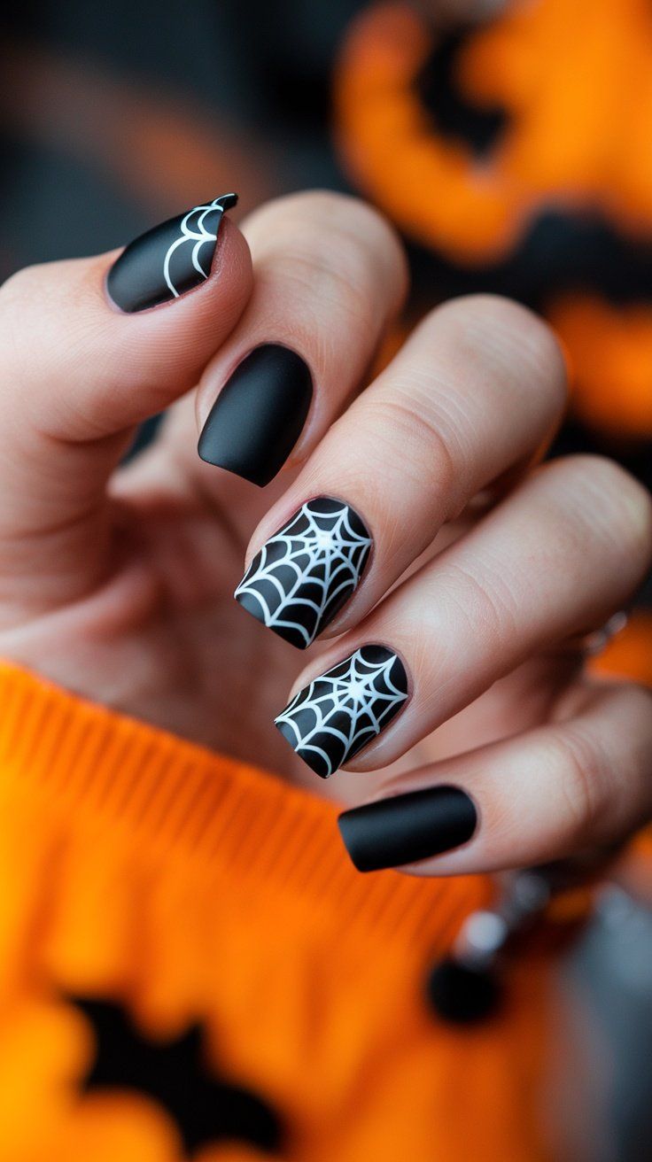 Intricate white spider web art on accent nails, sharp and symmetrical