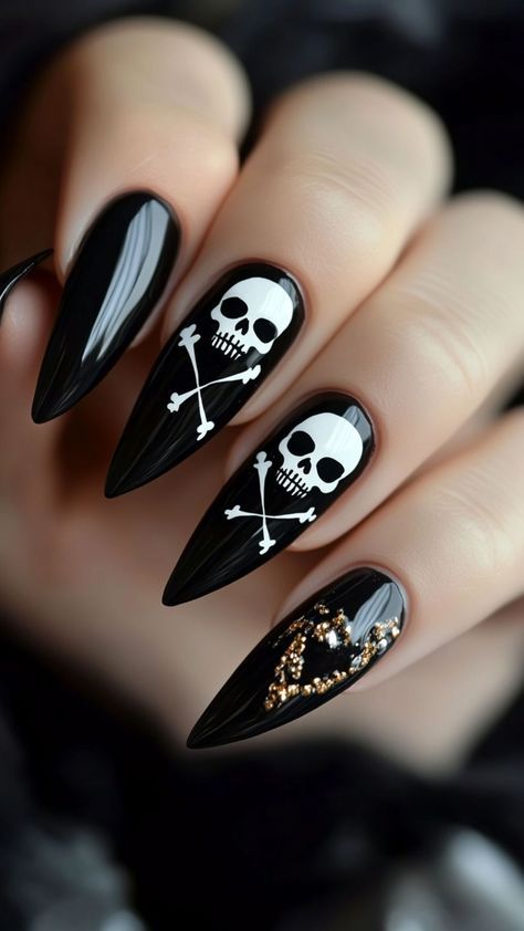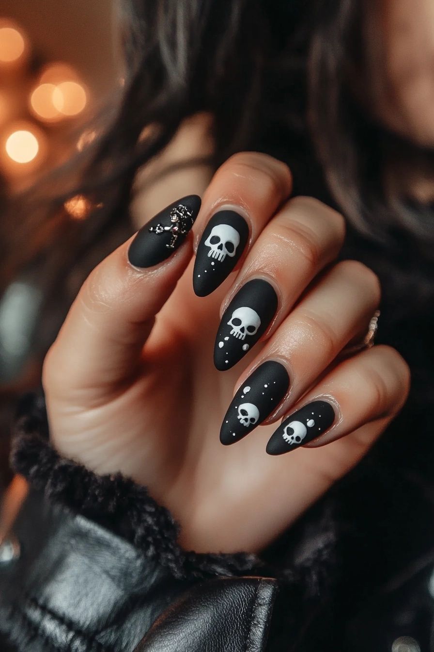 A matte black canvas sets the stage for bone-white skull art and tiny scattered dots, creating a haunting yet minimalist masterpiece. The stiletto shape enhances the eerie elegance, while the matte finish keeps things modern and fashion-forward. This design works beautifully for slender fingers, adding drama without overloading the detail. It’s ideal for costume parties, underground Halloween events, or even your go-to October night-out look. Just skip it for formal workspaces unless your boss has a dark side.