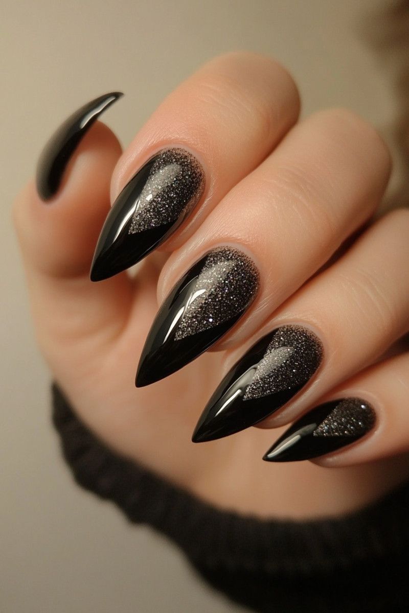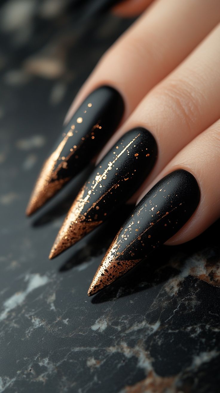 Here’s a look that whispers elegance but screams Halloween. A black matte base meets a sharp gradient of copper glitter — the result is pure witch-glam. These ultra-long stiletto nails demand attention and pair best with long sleeves and leather textures. While stunning, this look isn’t the most practical for hands-on tasks — so save it for the weekend, parties, or stylish soirées.