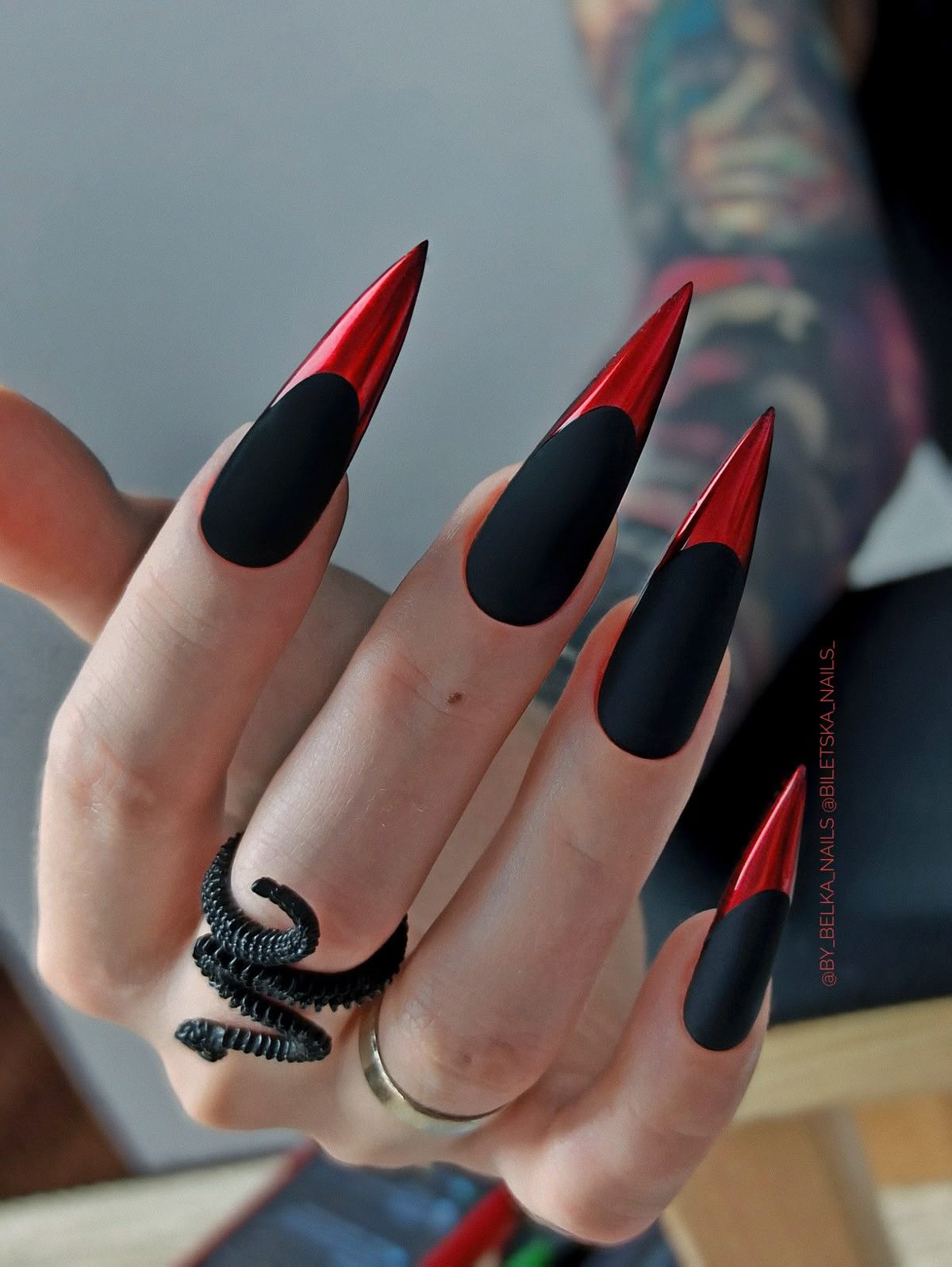 This one’s pure seduction. Matte black ovals transition into razor-sharp red chrome tips, evoking vampiric elegance and classic Halloween femme fatale. It’s incredibly bold, so best suited foredgy personalities and after-dark outfits. While impractical for everyday errands (say goodbye to contact lenses or buttoned shirts), it’s perfect for theatrical nights and Halloween-themed galas.