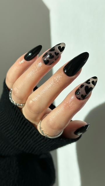 Sometimes, the most chilling messages come wrapped in sweetness. This almond-shaped set blends glossy black with a sheer base scattered in jet-black hearts. It leans more cute than creepy, but don’t be fooled — this design is still in Halloween territory. It’s ideal for teens, soft goth looks, or anyone flirting with a more romantic version of spooky.