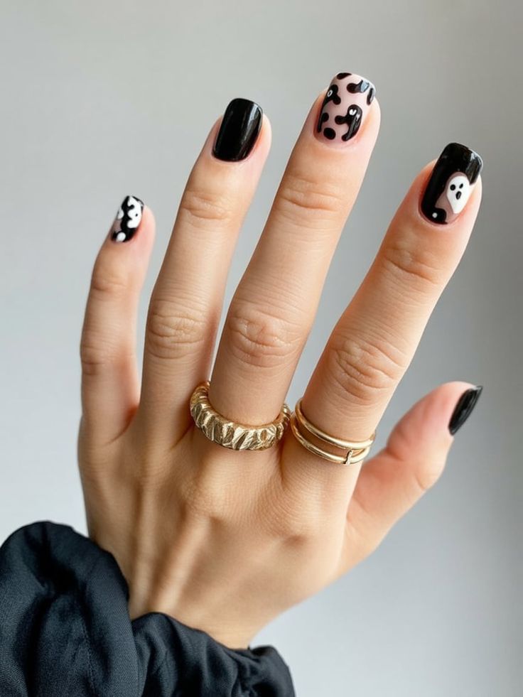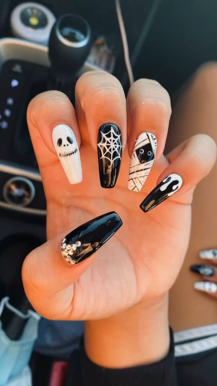 If you’re torn between sparkle and spooky, this one’s for you. Tiny designs ghost float atop a glittering backdrop of silver and black, with glossy tips adding extra polish. It’s fun, festive, and surprisingly versatile. The shape is elegant, while the art keeps it seasonal.