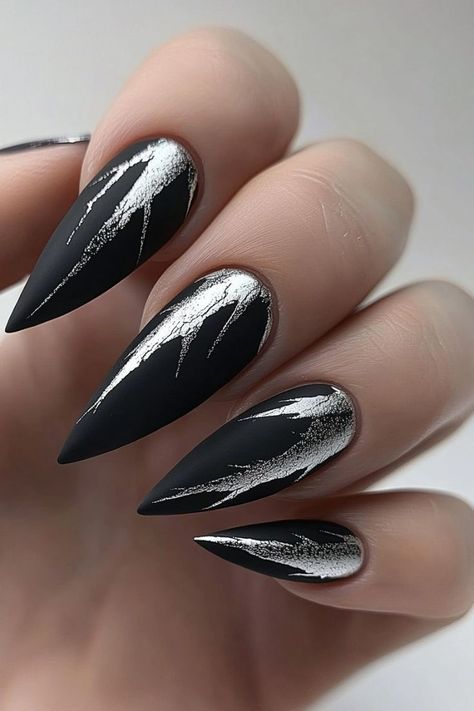This one is all about controlled chaos. A matte black base slashed with silver chrome streaks feels like lightning bolts or claw marks. It’s sleek, simple, and wildly effective. Great for those who want to stay within minimal tones but still want a touch of Halloween edge.