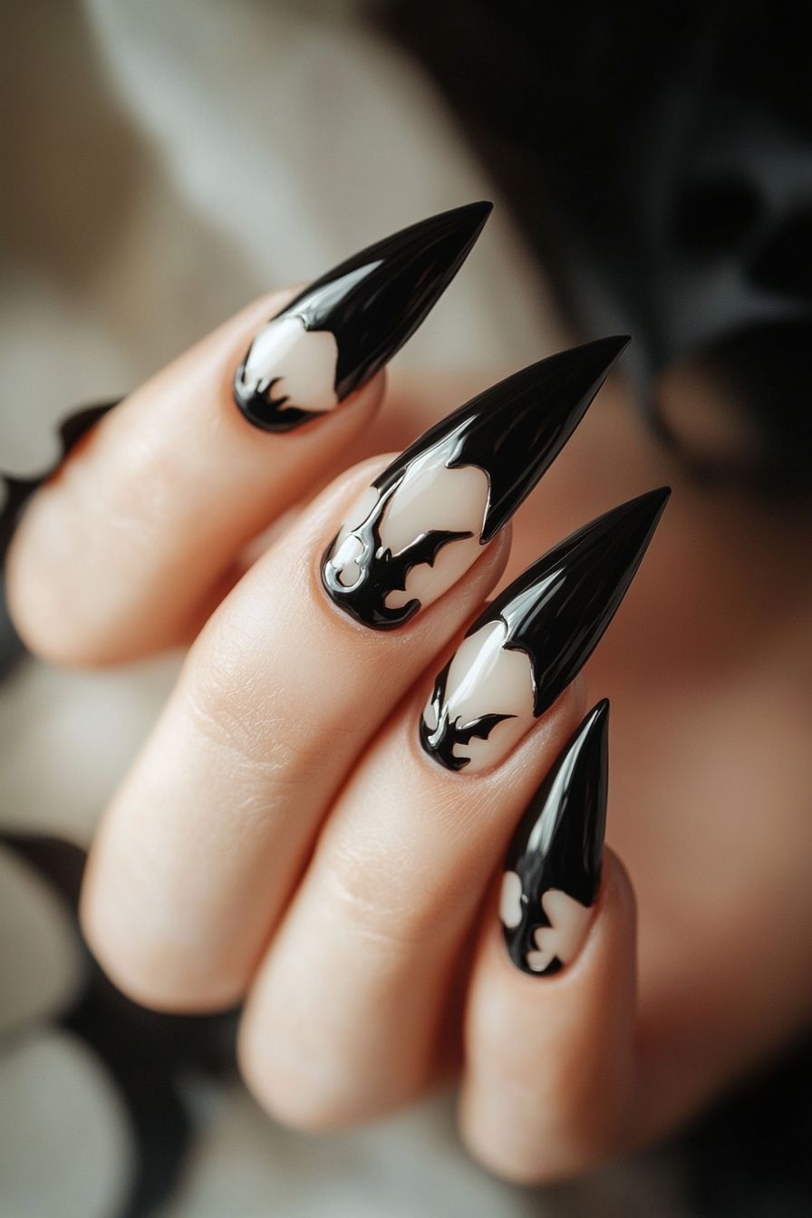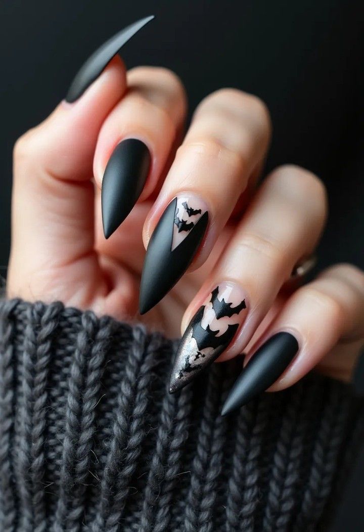 Here’s a matte-meets-metallic masterpiece for true Halloween lovers. The bat silhouettes float on a mix of solid and negative space backgrounds. The extreme stiletto shape adds intensity, though it may not be the most practical choice for everyday wear. Great for costume parties or eerie editorials—it’s more about mood than function.