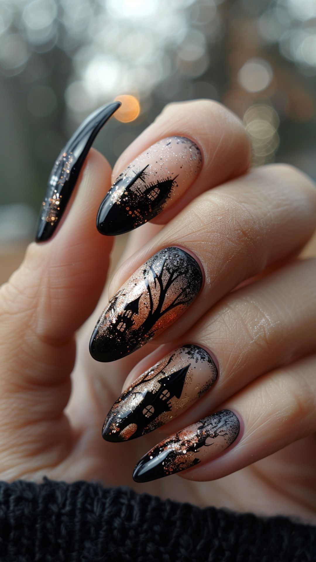 Talk about an atmospheric manicure. This designs almond look features a soft ombré base layered with glitter and silhouetted haunted houses. Each nail tells a story—twinkling lights, spooky trees, and chilling windows. It’s a wearable Halloween fairytale. Best for creative types and those with a love for visual storytelling.