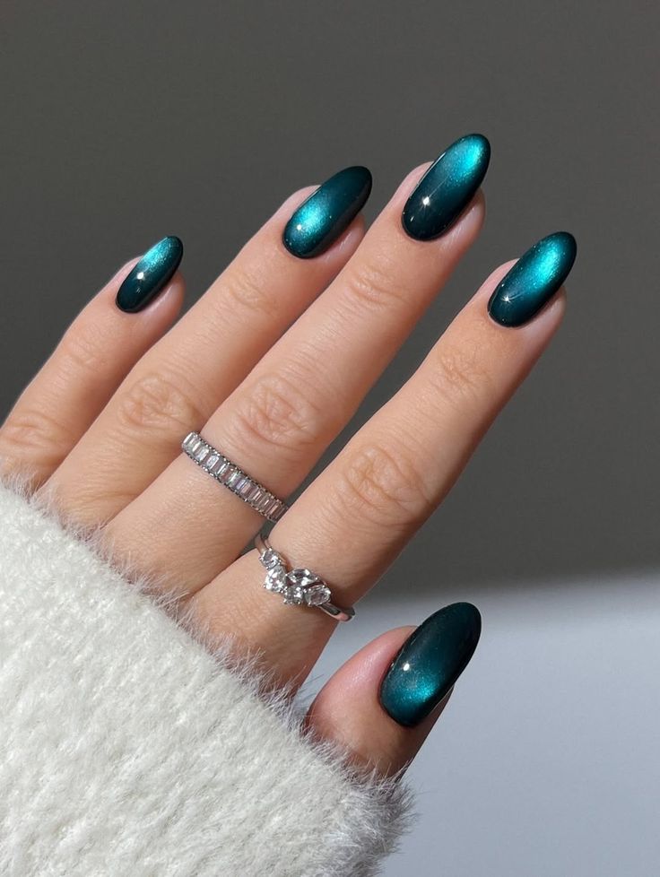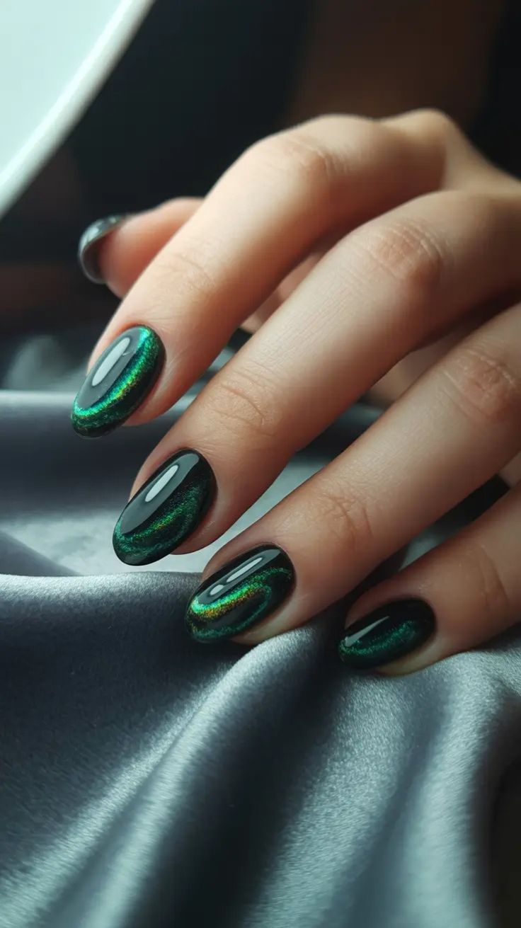 That deep green magnetic shine feels straight out of an emerald vault — dark, moody, and impossibly chic. The reflective streak dances like silk under light, giving every move of the hand an effortless glow. This design flatters medium to long nails and looks especially luxe on almond shapes. Perfect for cooler months, its subtle drama makes it an ideal choice for evening dinners, date nights, or winter soirées — though perhaps too intense for minimalist daytime wear.