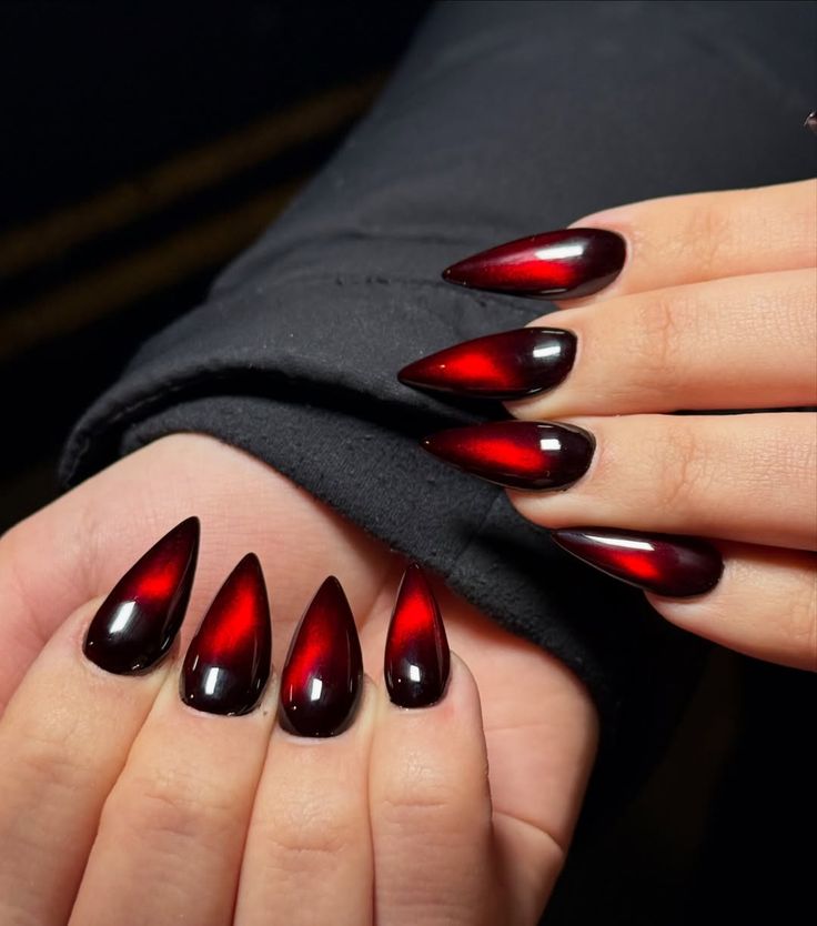 This design is the definition of deep, dramatic seduction. The base — a rich dark red bordering on burgundy — creates an intoxicating canvas for the magnetic cat-eye shimmer to flow. It’s a look made for late-night dinners or autumn nights when everything feels cinematic.