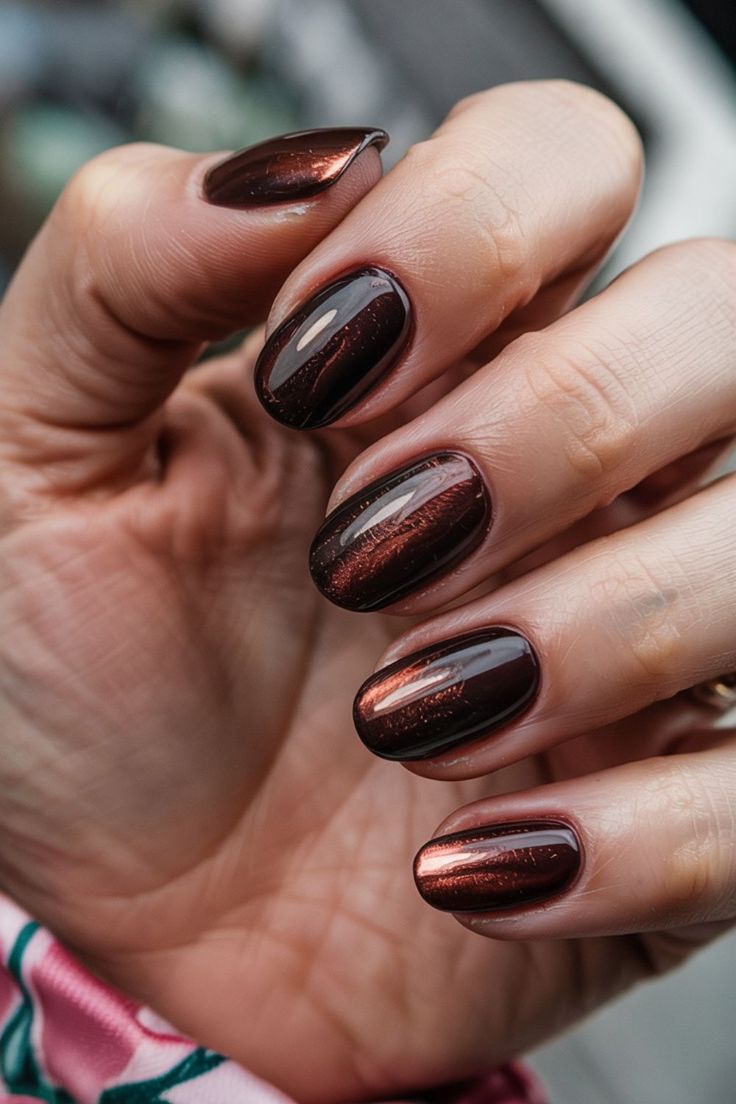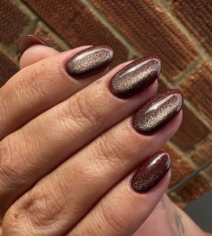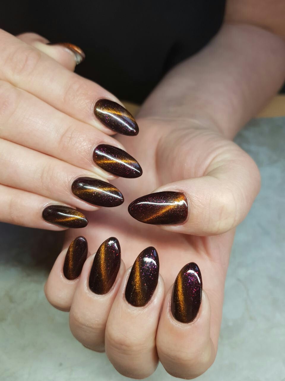This style radiates warmth — a fiery fusion of brown, red, and glowing gold. The magnetic effect creates a flame-like stripe, mimicking molten metal. It’s bold, confident, and perfect for cooler months when your nails deserve to make a statement.