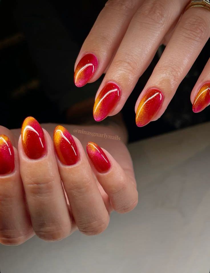 This one’s pure passion. The red cat eye shimmer feels like a galaxy condensed into one color — fiery, magnetic, and impossible to ignore. It’s a modern take on classic red nails, with just enough sparkle to make it festive yet elegant.