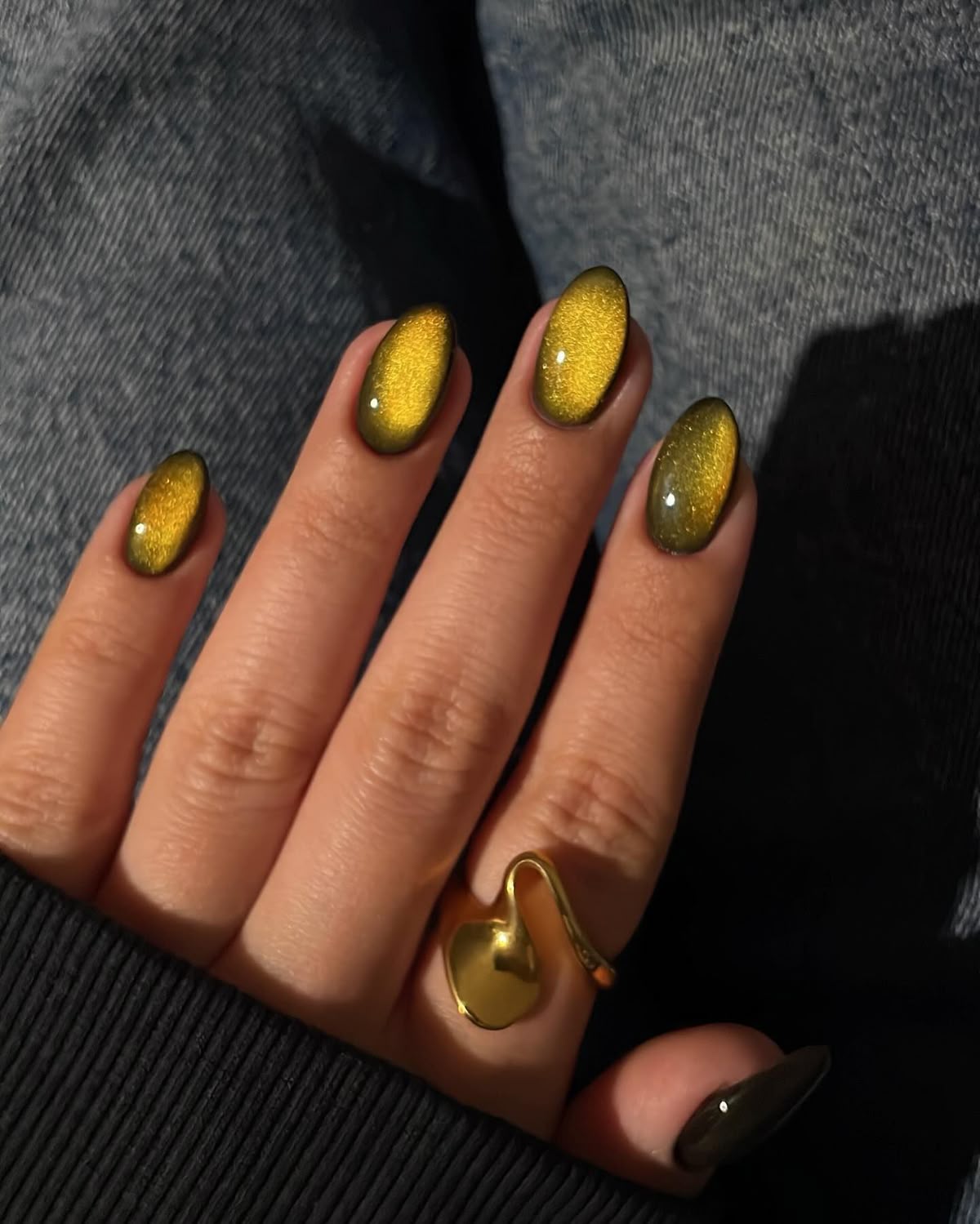 Olive tones are having a serious fashion moment, and this nail set proves why. The rich green base, accented by a gold-infused magnetic line on one finger, offers an elevated French reinterpretation. It’s earthy, minimal, and sophisticated.
