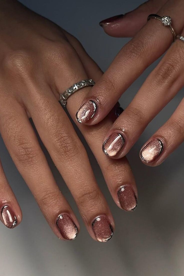 This final look offers a soft neutral shimmer with a metallic rose-gold tone. It’s refined and wearable, blending the magnetism of the cat-eye trend with everyday versatility. The reflective borders subtly frame each nail, creating a modern mirror-edge effect.