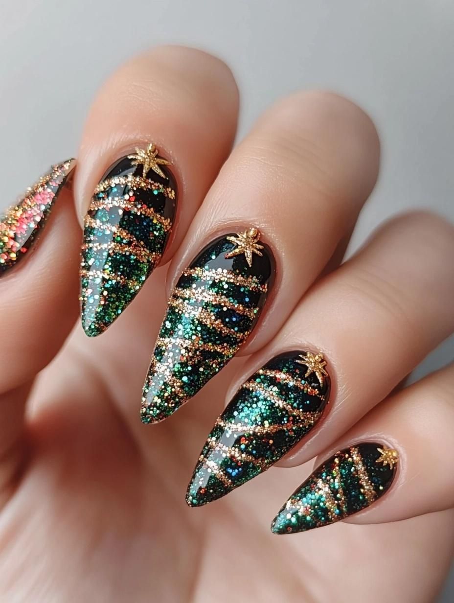 When the holidays call for drama — this is it. Drenched in green, gold, and multicolor sparkle, this art design transforms your nails into miniature Christmas trees. The 3D illusion from layered glitter stripes is mesmerizing, especially under twinkling lights.