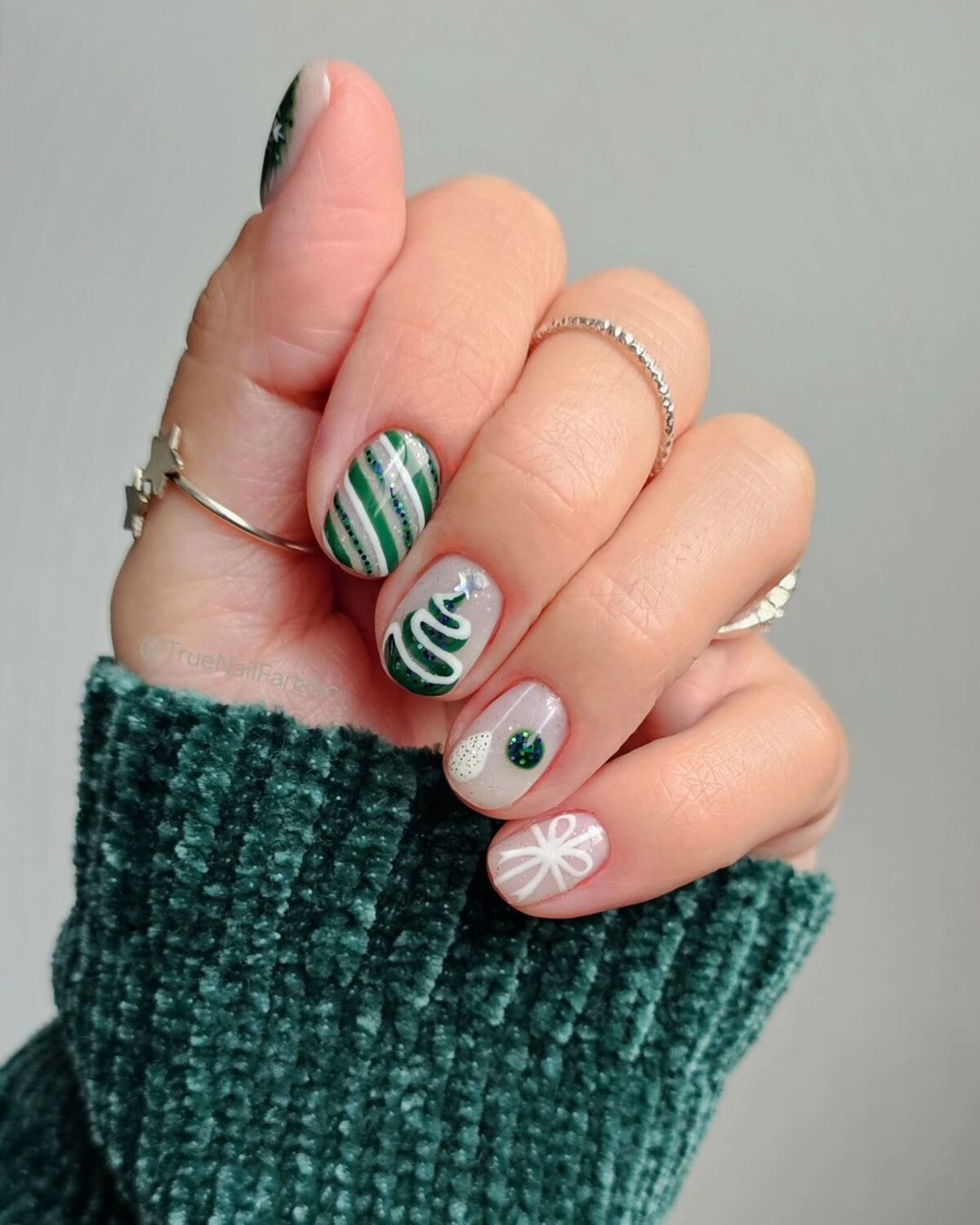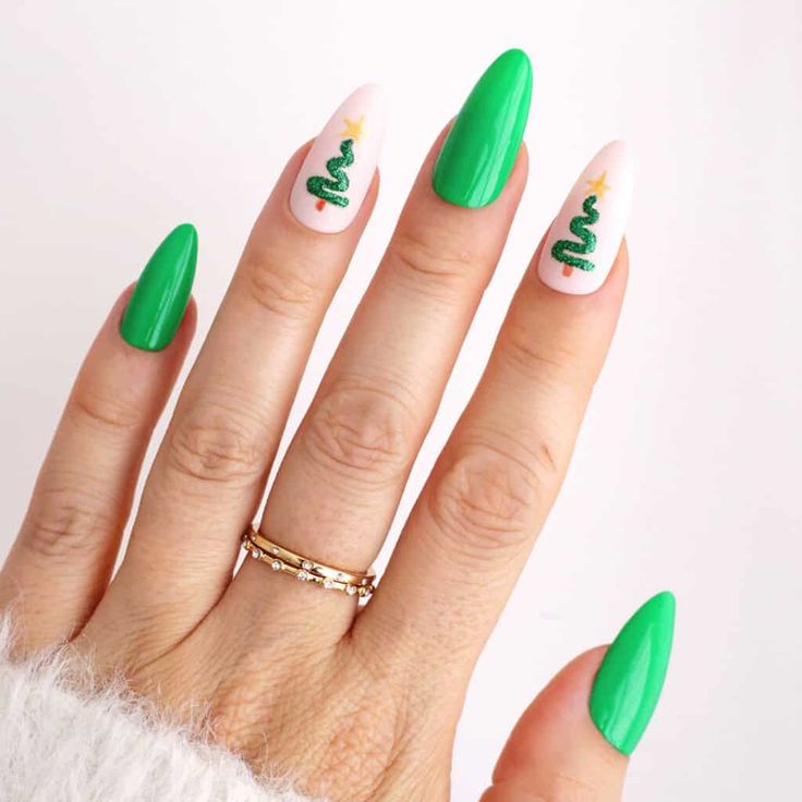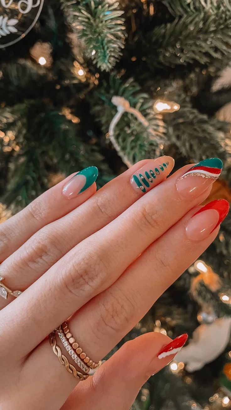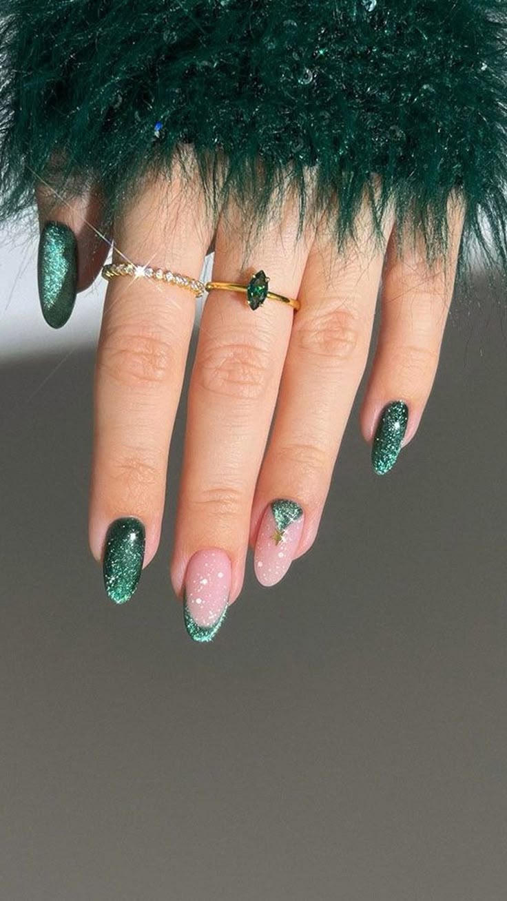 I have to admit, this one took my breath away. Deep emerald glitter nails paired with soft blush accents — this look defines holiday inspo. The combination of full green shimmer and minimalist tree tips gives it a fresh, editorial edge. It’s festive enough for parties but still classy enough for a dinner date.