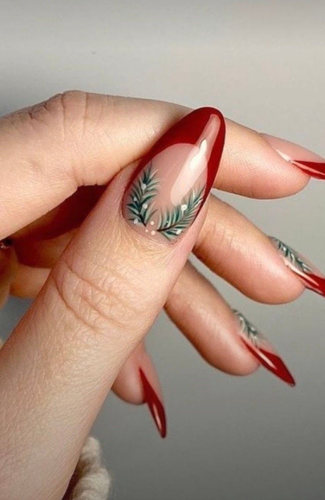 Details: Red French tips and green holly leaves with tiny 3D berry dots.