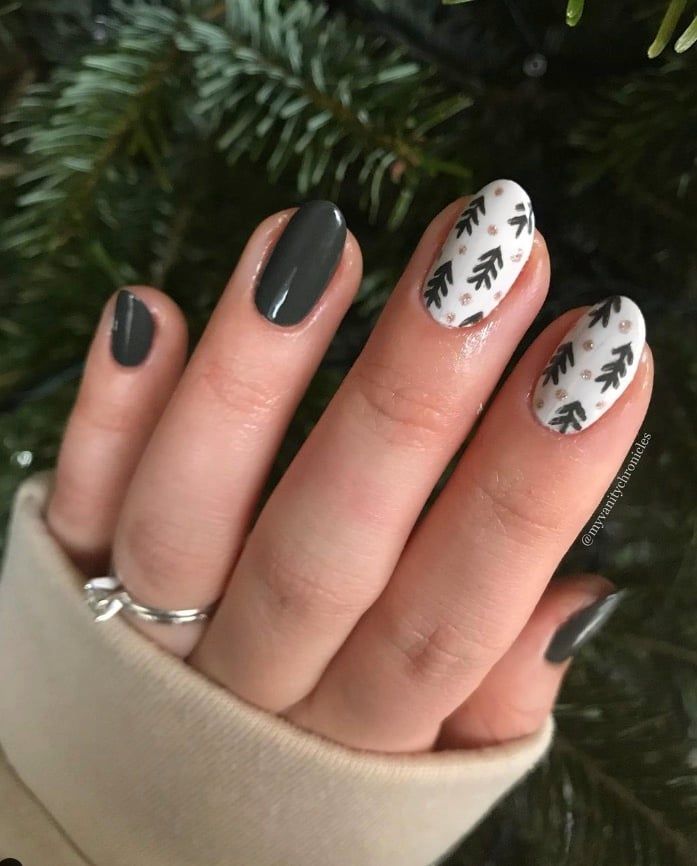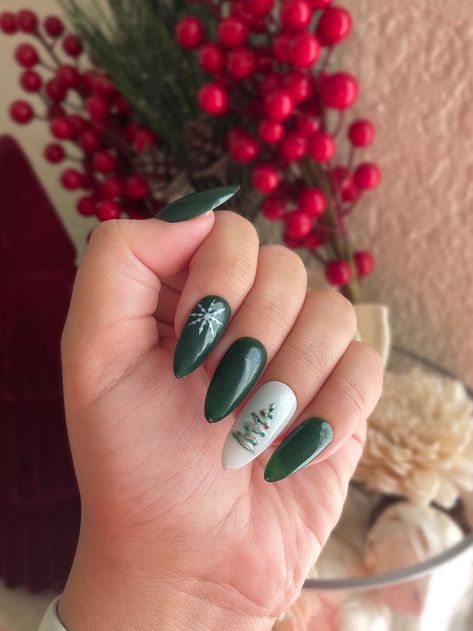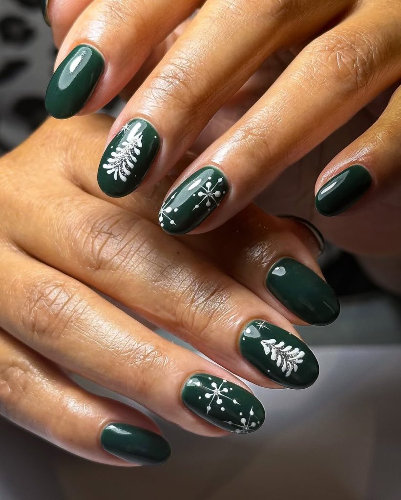 A deep green winter palette meets elegant white accents — pure sophistication. The contrast between the lush black-green nails and the single white nail with a subtle tree design gives it a modern edge.