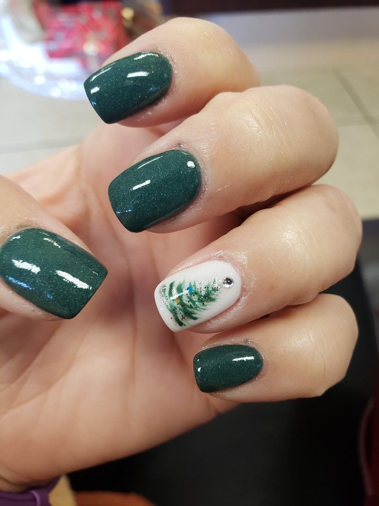 Base: Jet green gel with a white highlight nail featuring a single Christmas tree motif.