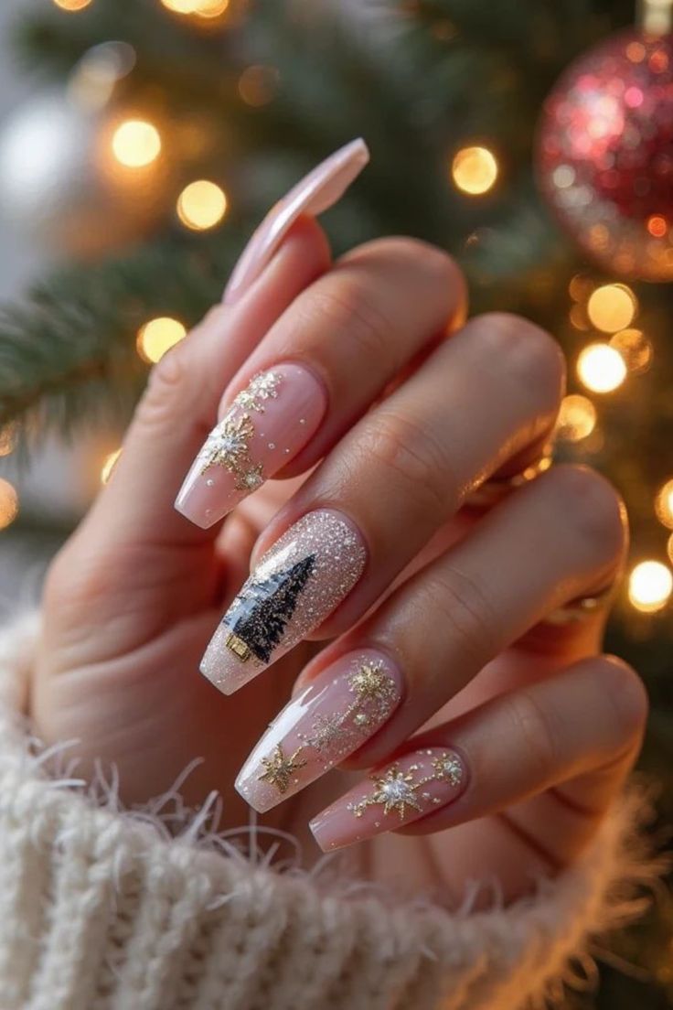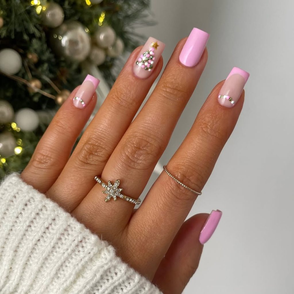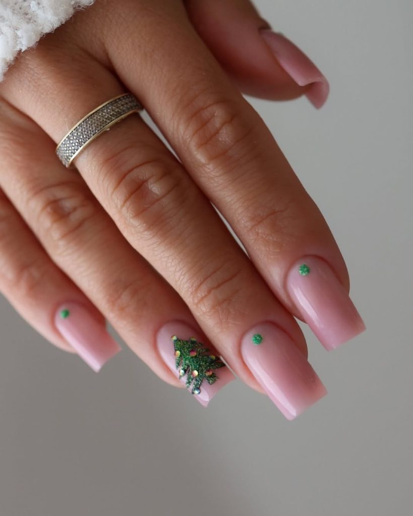 This manicure speaks to my love for designs simple but deeply elegant. The squared acrylic shape paired with a milky pink base feels soft and feminine, while the tiny green glitter tree adds that Christmas surprise without going overboard. This look is ideal for those who prefer subtle holiday nods — perfect for office parties or family dinners where you want to look festive yet refined.