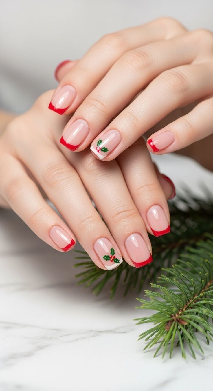 Classic, timeless, and effortlessly festive — this manicure blends red French tips with dainty holly accents. It’s the perfect design simple lovers dream of: clean lines, natural tones, and just enough Christmas cheer.