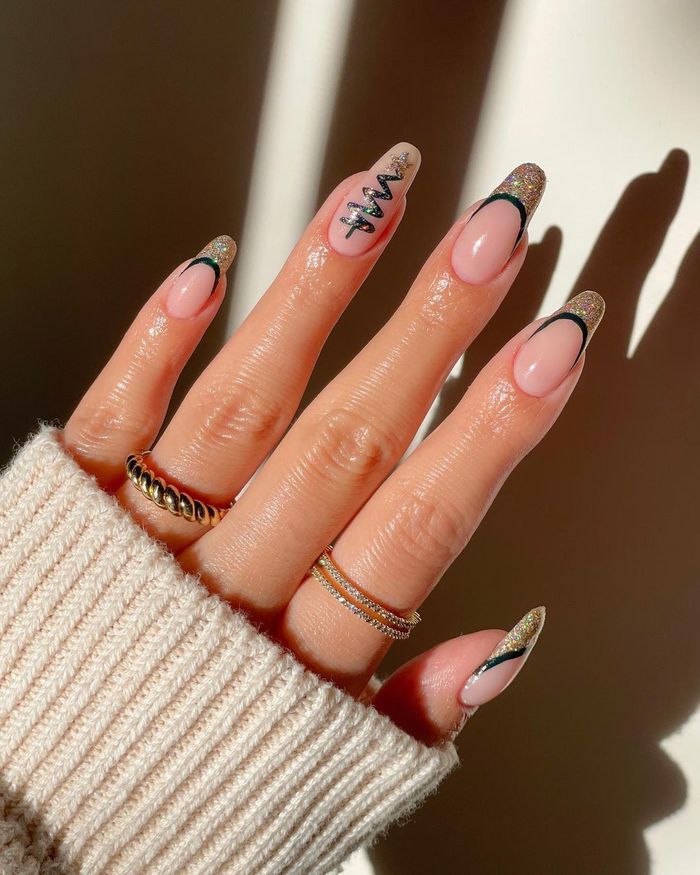 To upgrade it? Try a gold outline around the green nails for a more dramatic evening look. Just don’t add extra rhinestones — the sparkle is already perfection.