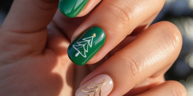 There’s something striking about high-gloss black-green polish contrasted with a crisp white accent nail. This look captures the spirit of the season with minimalist confidence. It’s sophisticated and ideal for those who like their holiday nail art bold but not busy.