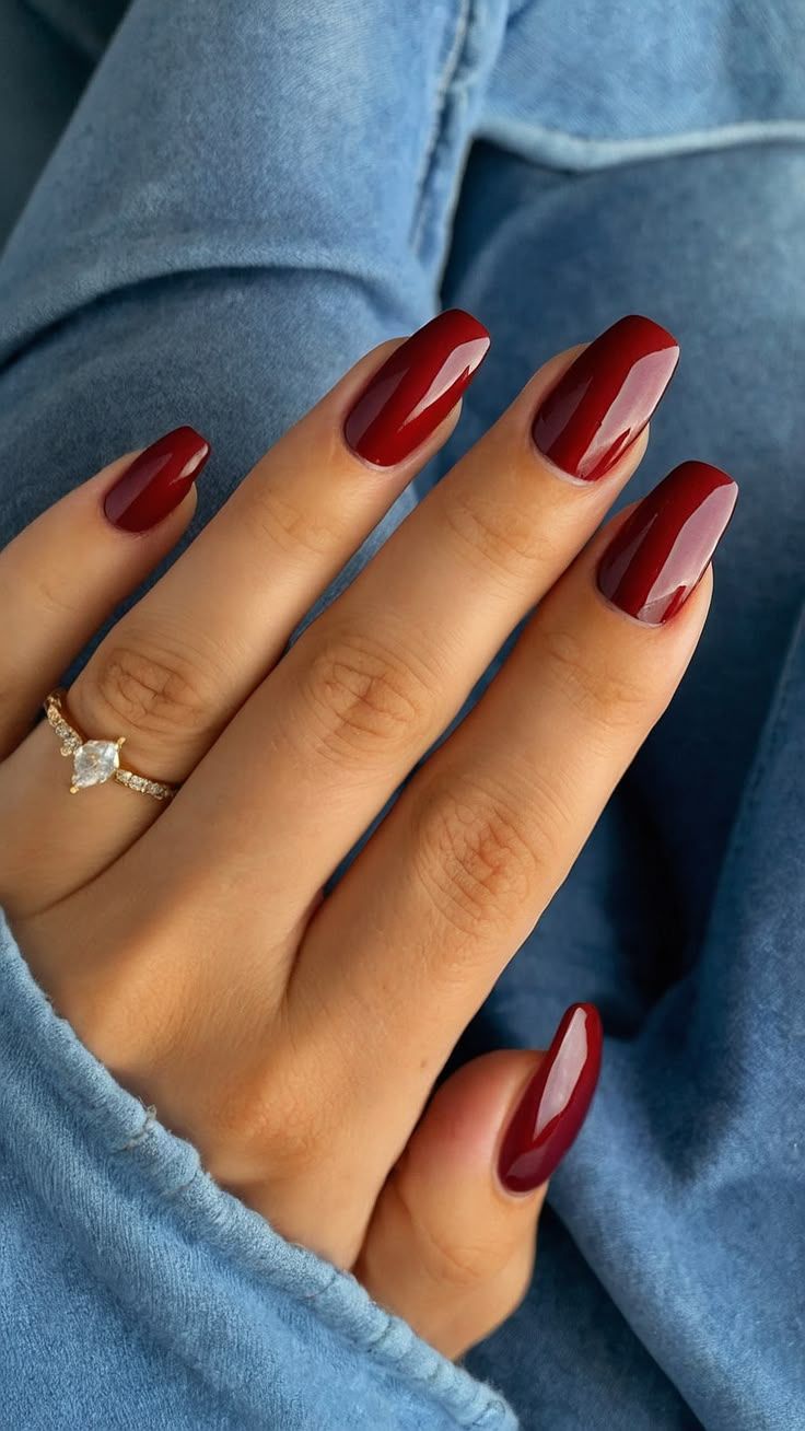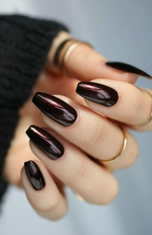 The almond shape here feels timeless yet daring, coated in a high-shine burgundy that’s almost black in certain light. This is a manicure that flatters longer fingers and pairs beautifully with sleek eveningwear. It’s not the most practical option for heavy day-to-day tasks, but for formal dinners, gallery nights, or fall weddings, it’s a showstopper.