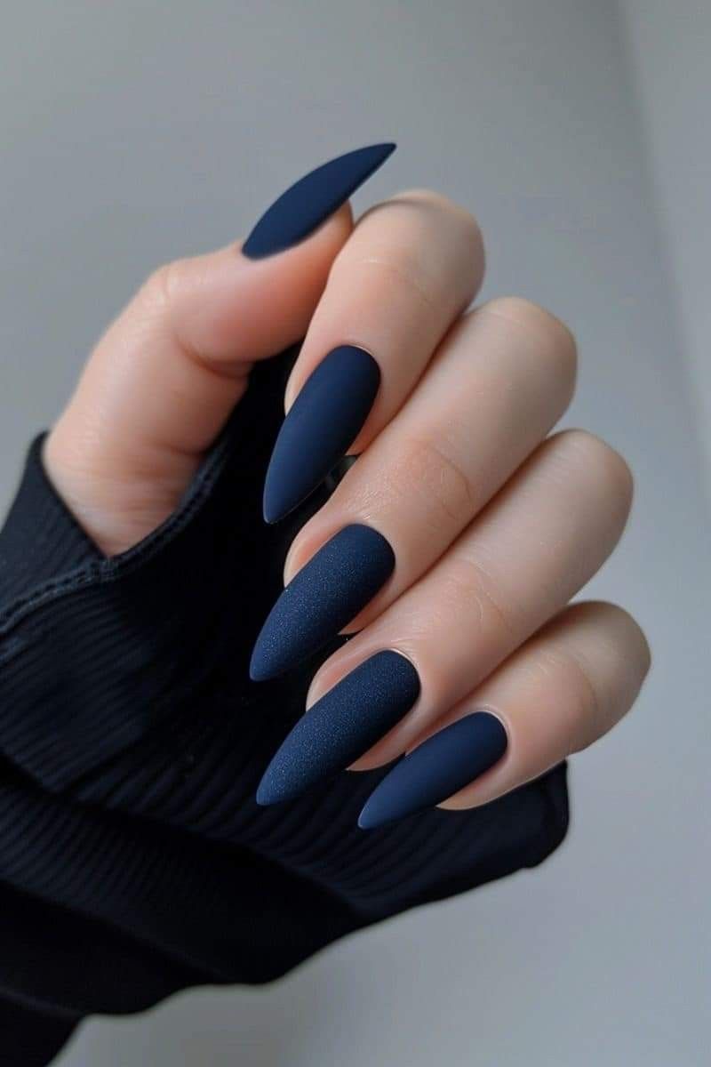 A deep, simple navy brought to life in a matte finish — this acrylic almond look is quiet luxury at its finest. The texture adds a layer of sophistication, while the elongated tip makes it undeniably chic. Ideal for colder months, evening outings, and anyone craving dark tones that aren’t black.