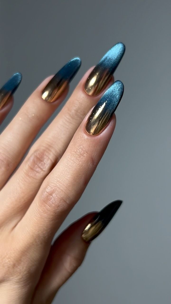 A design that looks like a luxury sports car in nail form — the gradient from oceanic teal to molten gold is pure inspo. This one’s for the risk-takers, the trendsetters, and anyone who sees nails as a canvas for art.