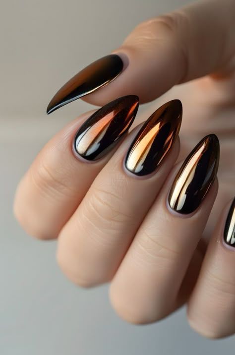 Tortoiseshell nails get a modern 2025 update here, blending amber, coffee, and honey tones in a glossy layered design. The almond shape adds elegance, while the varied pattern placement keeps it fresh. Great for autumn brunches, city strolls, and layered knit outfits.