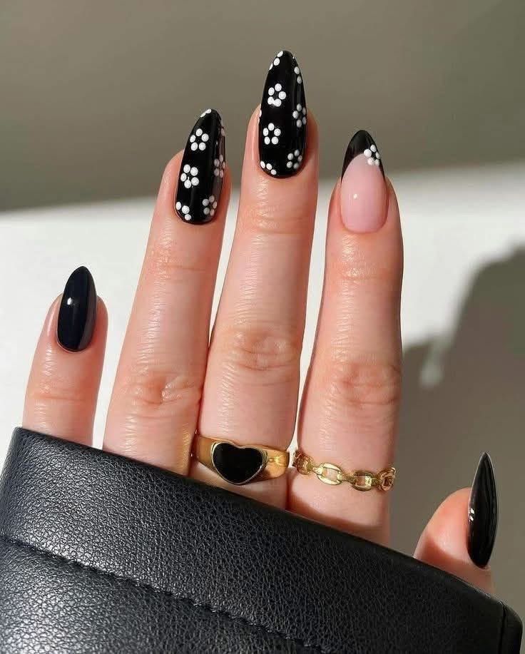 This set is proof that dark nails can still be cute. Black as the base, decorated with tiny white flowers, it’s a sweet-meets-edgy design that works for casual weekends, music festivals, or just bringing a bit of whimsy to your day.