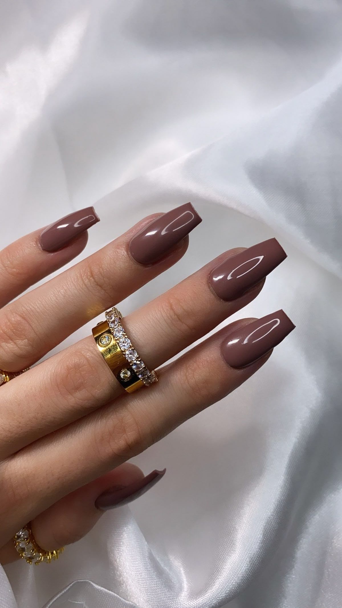 This rich colors gel dnd mocha is the nail equivalent of sipping a spiced latte in your chicest coat. The alternating tone on the ring finger adds just enough variation while keeping the palette grounded. Best suited for medium to long nails, this acrylic coffin long look works seamlessly for office days, coffee dates, and autumn brunches.