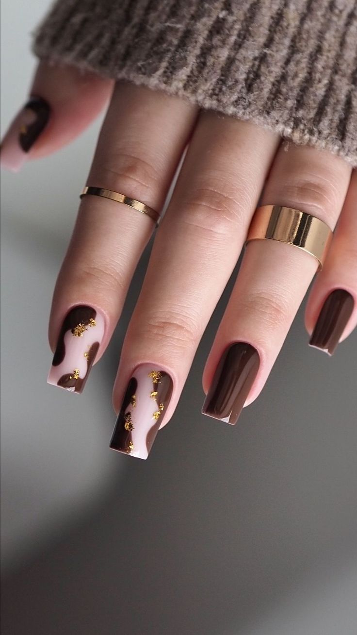 This is where art meets edible luxury. The warm chocolate brown base interplays with a wavy nude cutout and flecks of gold foil — the kind of detail that whispers “custom set.” The acrylic square shape gives a strong frame for the design, making it perfect for autumn parties or creative industry events.