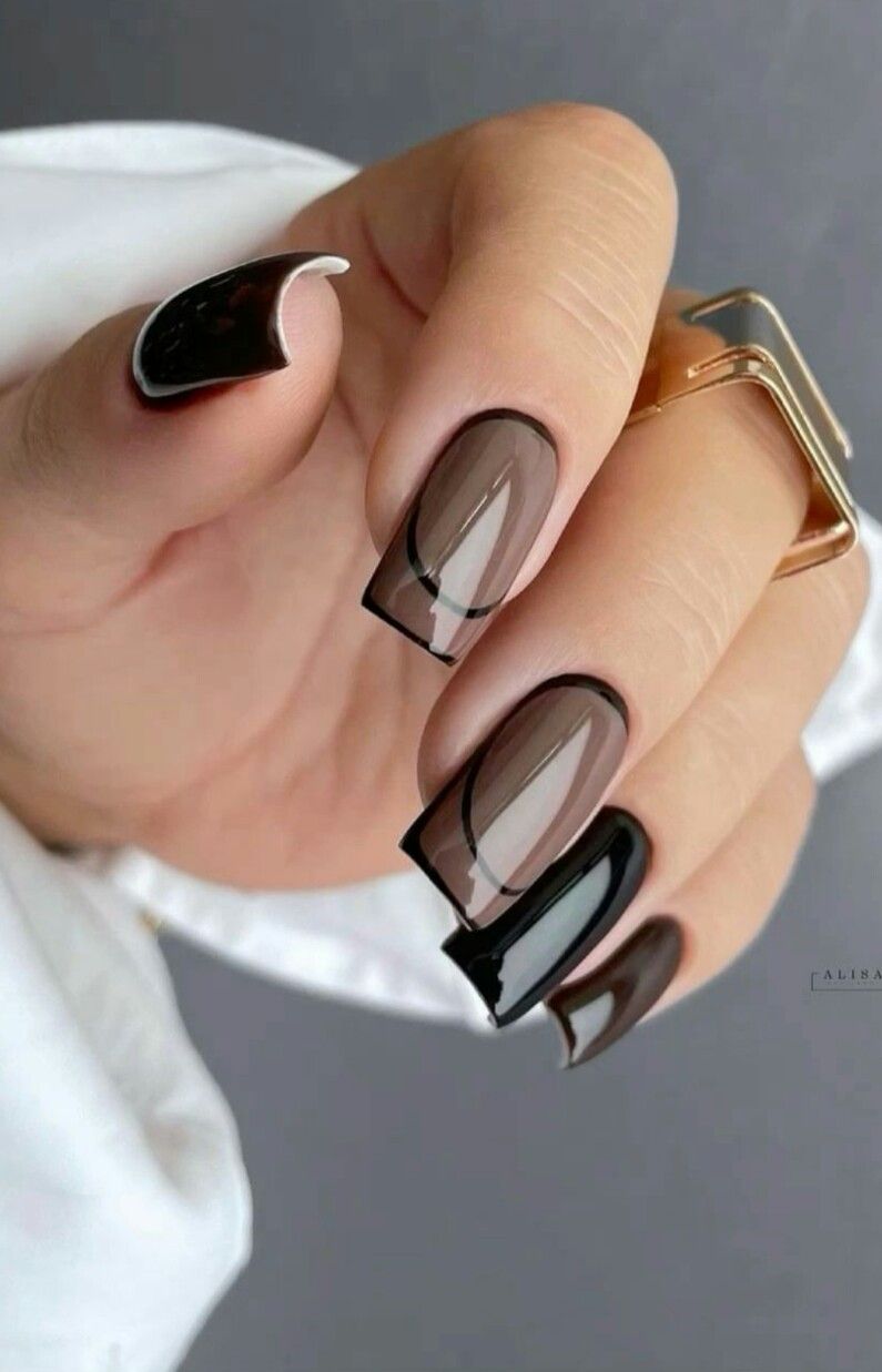 A moody reinterpretation of the French manicure, this design uses a translucent smoky brown base with black outline tips. It’s architectural, chic, and more wearable than stark white tips. Ideal for short square lovers who still want something conceptual.