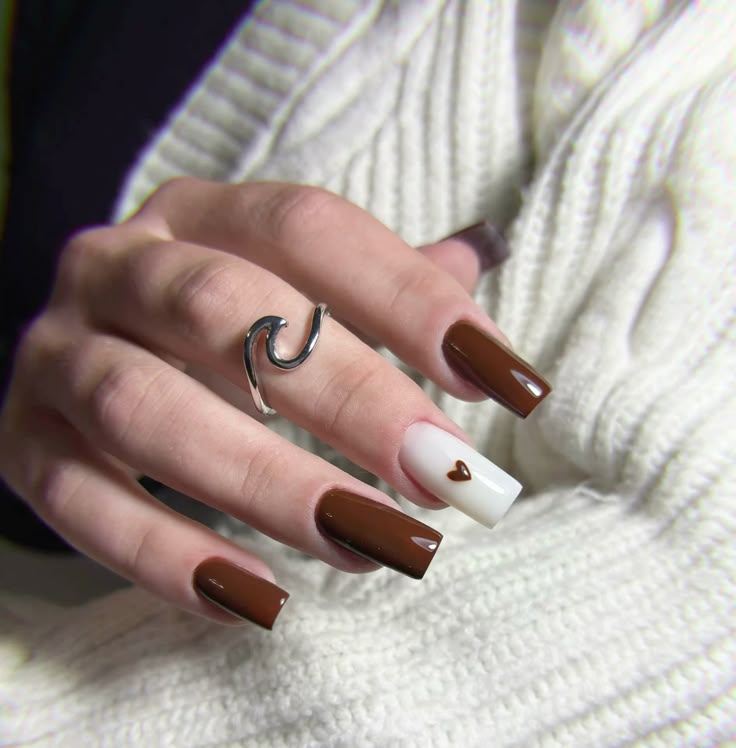 Rich coffee brown nails paired with a single white accent nail featuring a tiny heart — this is the perfect blend of cozy and cute. It’s inspo-worthy for casual dates, weekend coffee runs, or even as a warm holiday nail design. The acrylic square shape keeps it tidy and balanced.