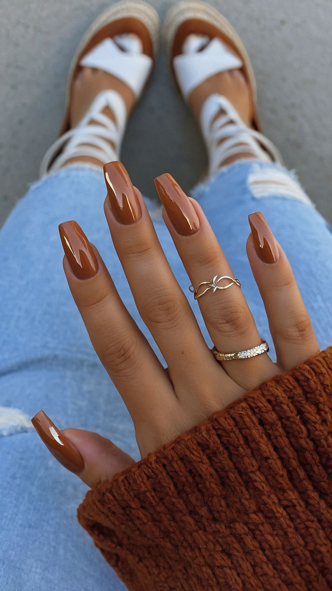 A single accent nail in gold chrome could elevate this into a holiday-ready look. Avoid pairing with neon accessories, which would clash with its rich fall vibe.