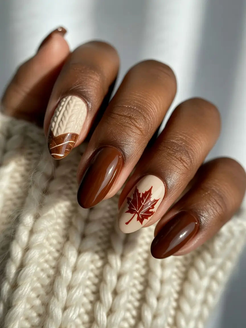 Here, art and seasonal symbolism meet. One nail features a knit-sweater texture, another a hand-painted maple leaf, all set against glossy chocolate and beige. The almond shape keeps it elegant while allowing for intricate details. Ideal for Thanksgiving gatherings or any event that celebrates autumn’s palette.