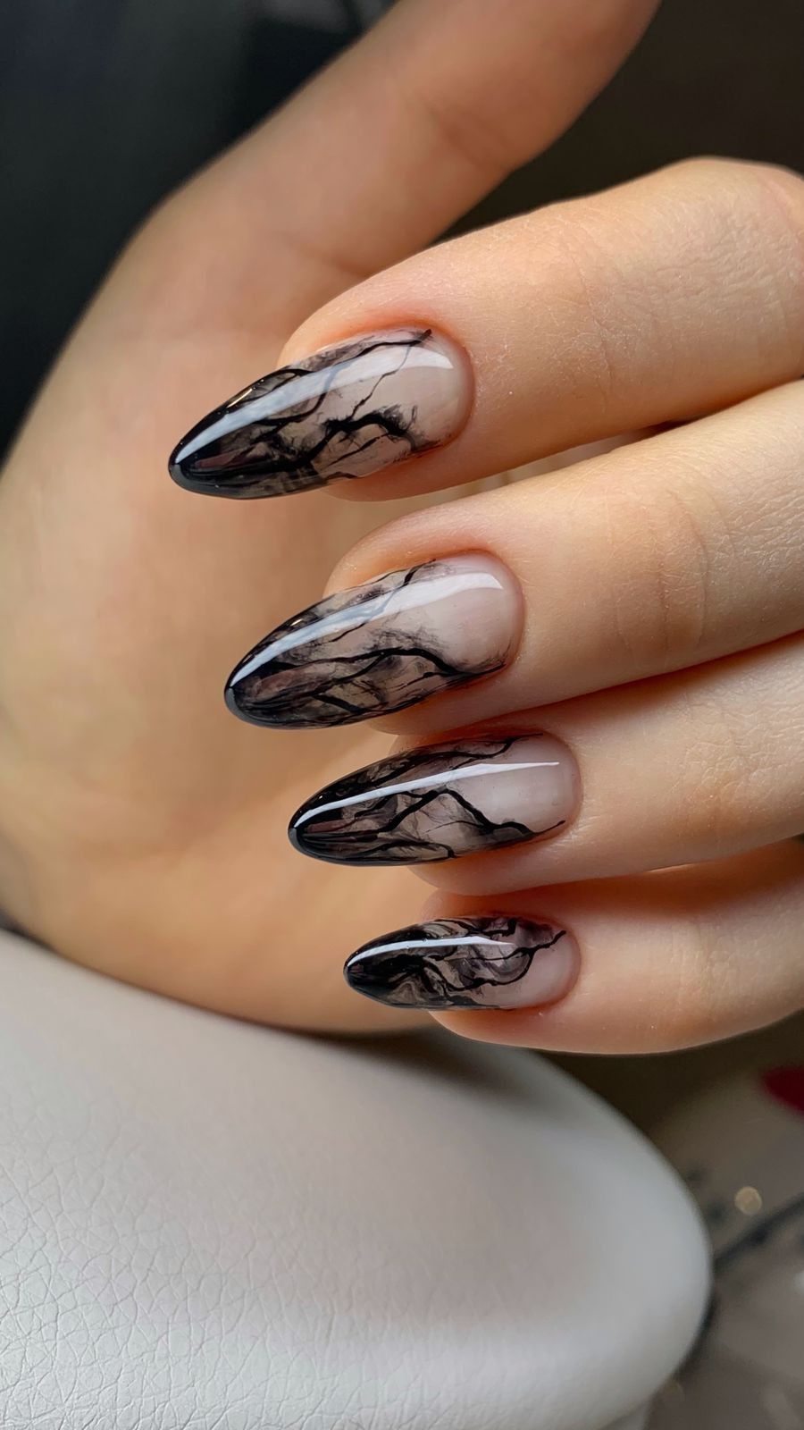 The elongated almond shape gives these nails an instantly elegant silhouette, but it’s the smoky black marble design that makes them mesmerizing. The blend of translucent nude with inky swirls feels like a piece of abstract art, effortlessly pairing with both edgy leather looks and minimalistic monochrome outfits. Perfect for evening events, autumn weddings, or even just adding intrigue to your everyday workwear, this style is surprisingly versatile despite its statement presence.