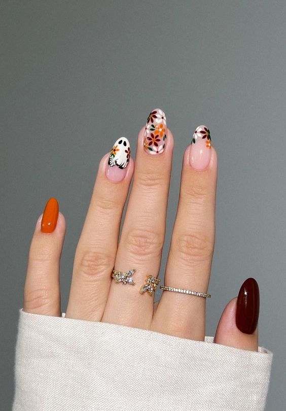 This nail design features a rich blend of autumn colors with detailed floral patterns. It’s a perfect representation of the fall season with a vibrant yet sophisticated look.