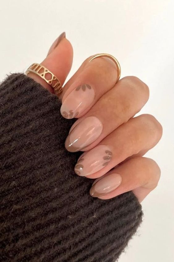 These nails offer a more subdued approach with a brown and nude color palette, adorned with minimalist floral designs. This look is perfect for those who appreciate subtle elegance.