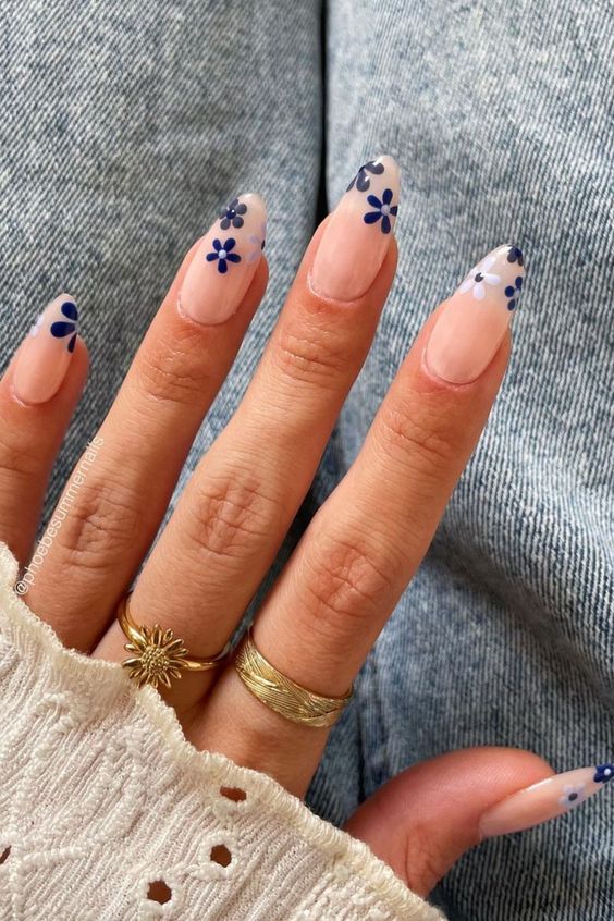 These nails feature a calming blue color with delicate floral designs, perfect for those who want a serene and elegant look.