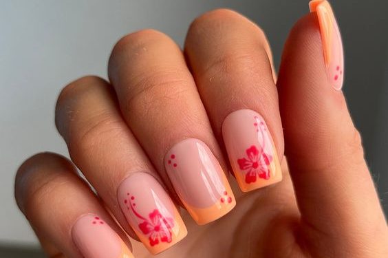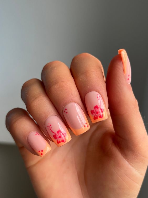 This design features a blend of peach tones with delicate floral accents, creating a sweet and charming look. Perfect for those who love soft, romantic nail art.