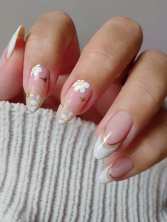 A nude base adorned with delicate white flowers and gold stars captures the whimsical beauty of a fall night sky. This 2024 design combines traditional floral elements with a modern twist.